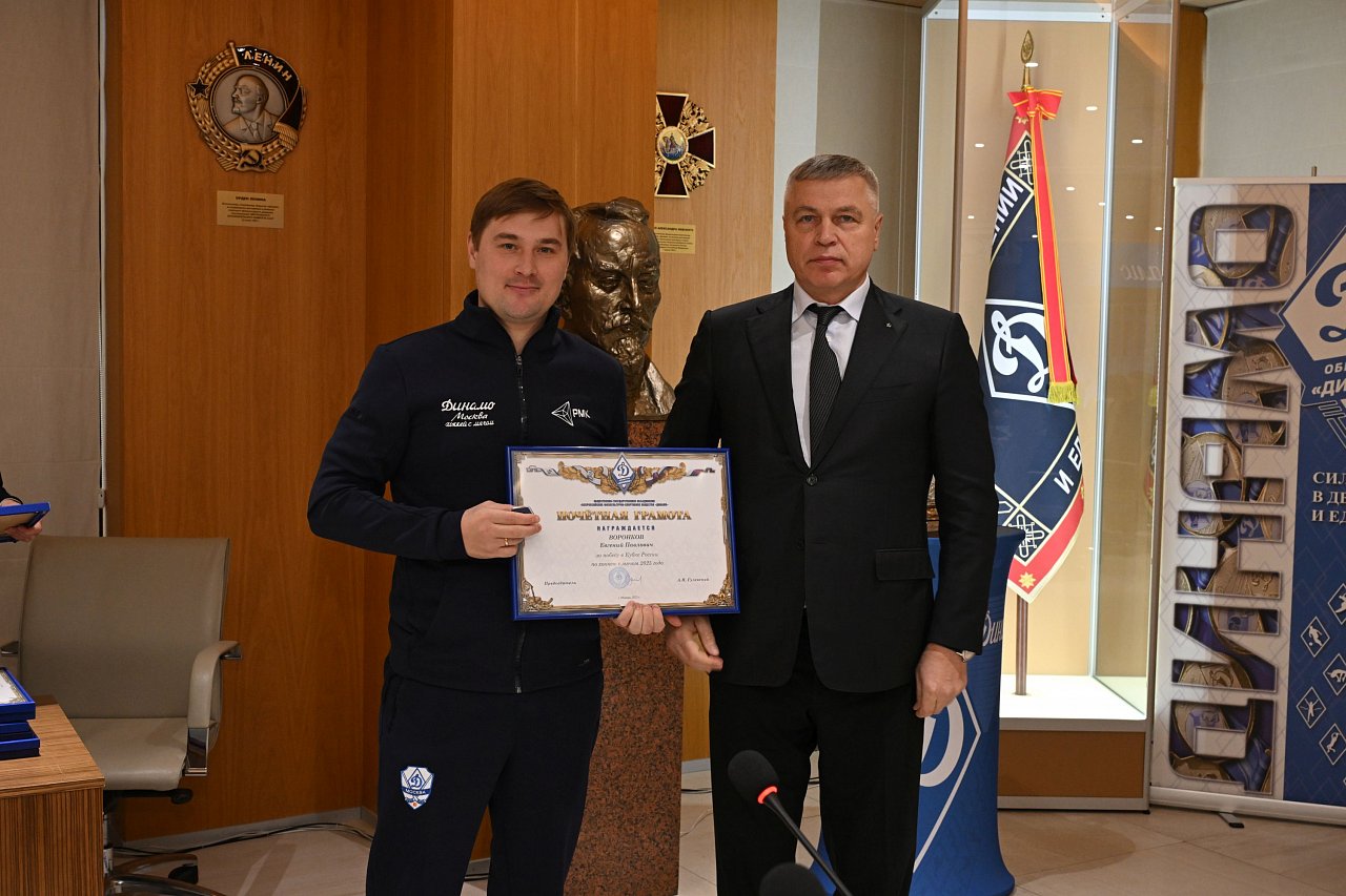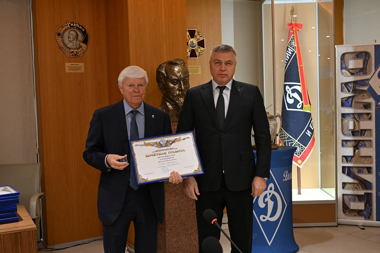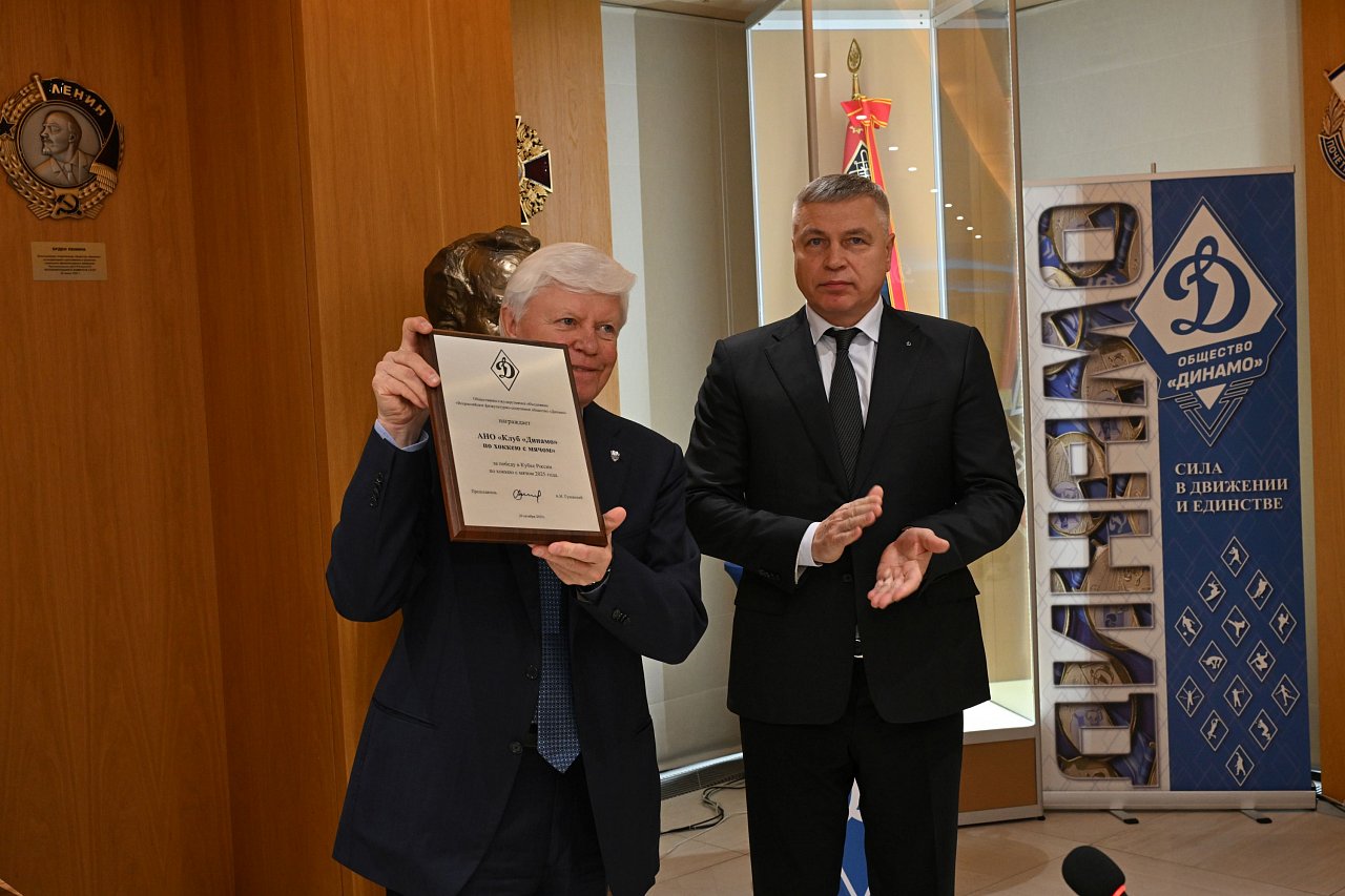 20 октября в офисе Общества «Динамо» состоялась церемония награждения динамовскими наградами спортсменов, руководителей и сотрудников клуба «Динамо» по хоккею с мячом за победу в Кубке страны 2025 года.