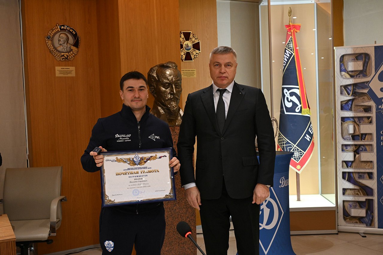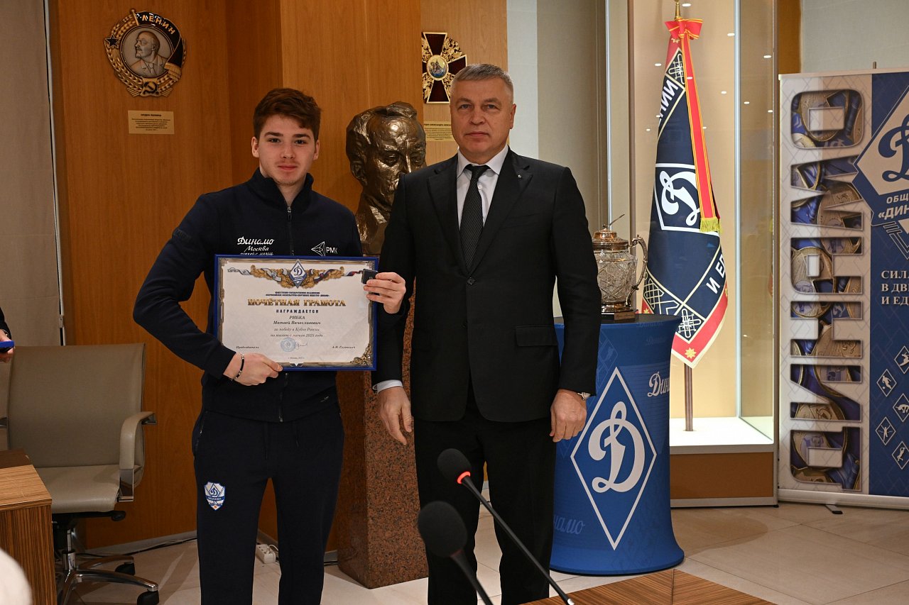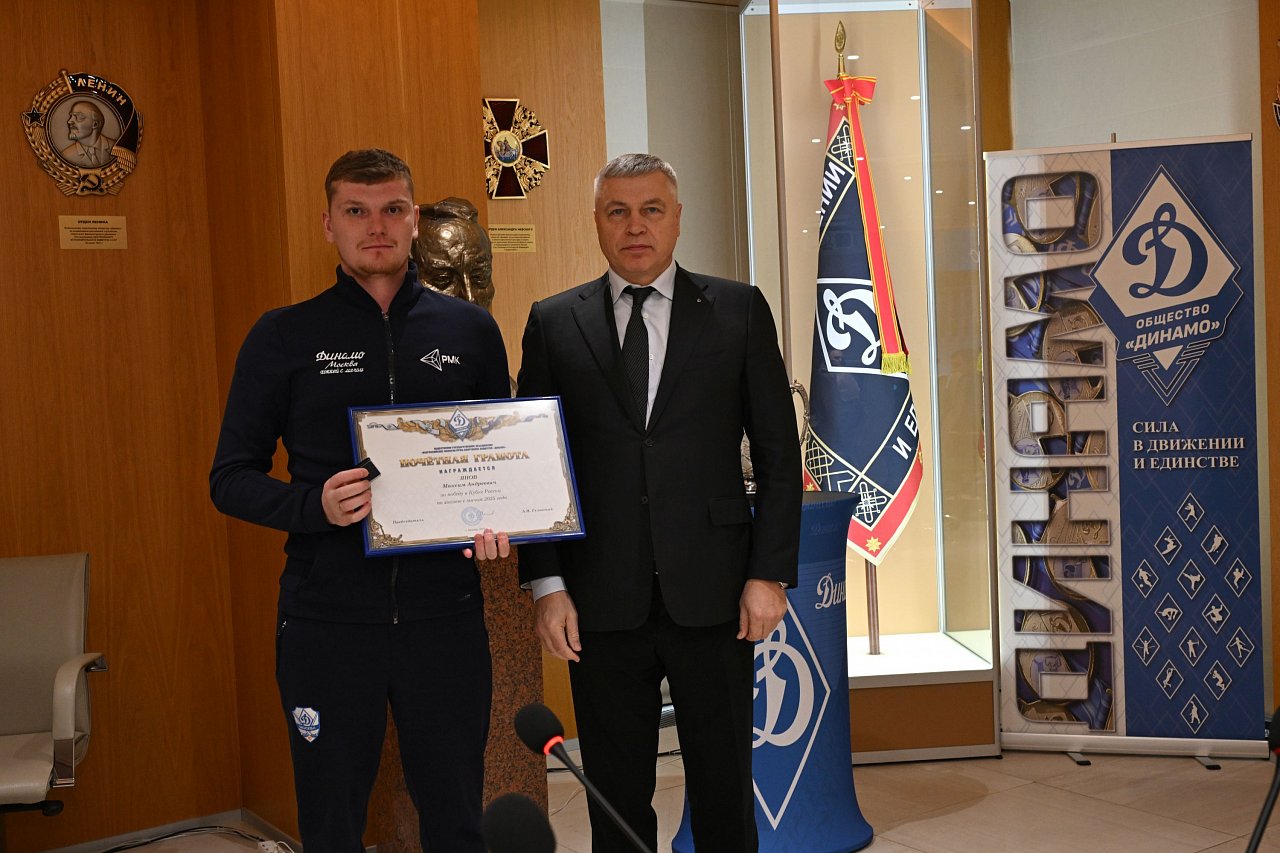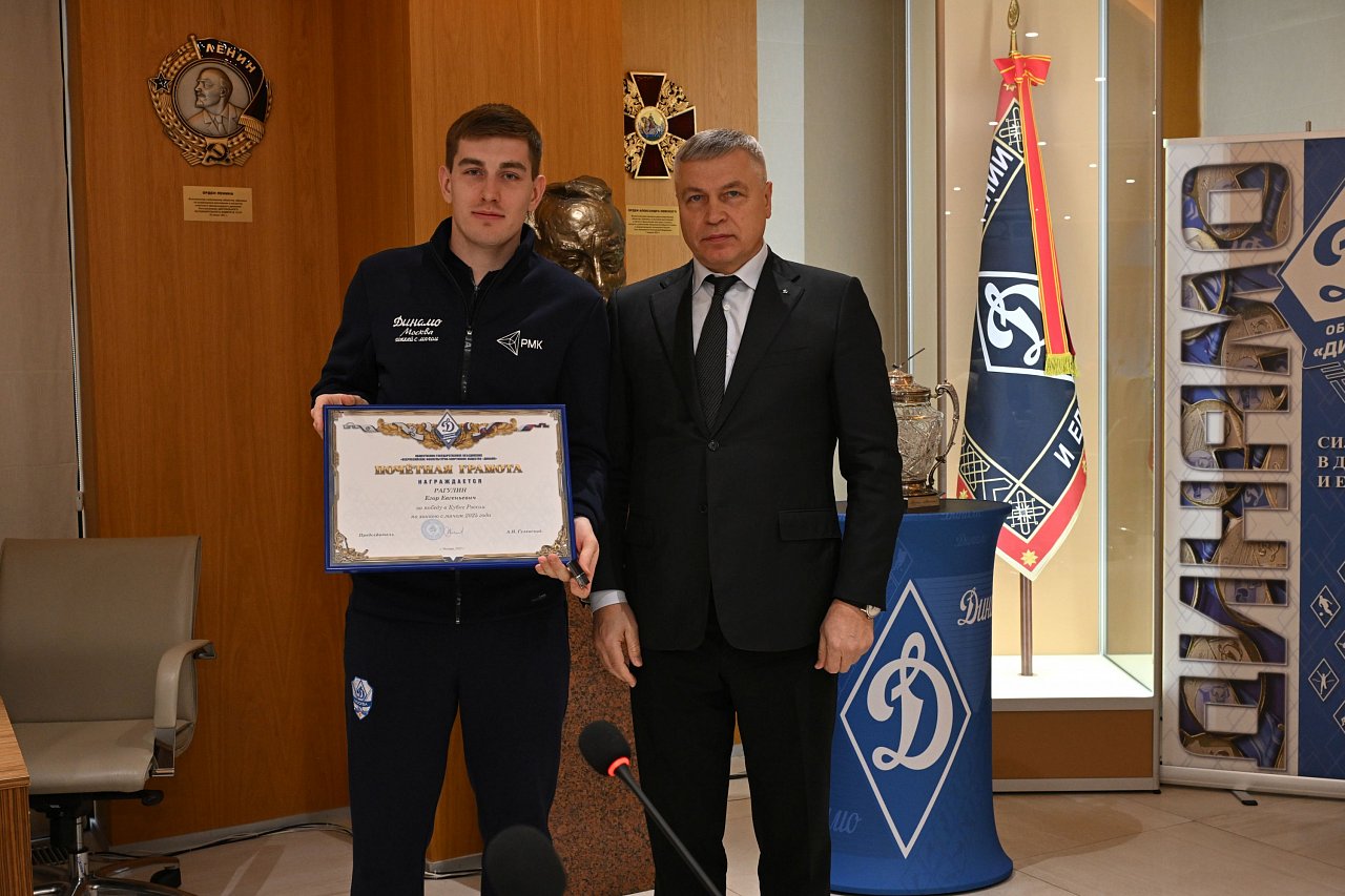 20 октября в офисе Общества «Динамо» состоялась церемония награждения динамовскими наградами спортсменов, руководителей и сотрудников клуба «Динамо» по хоккею с мячом за победу в Кубке страны 2025 года.